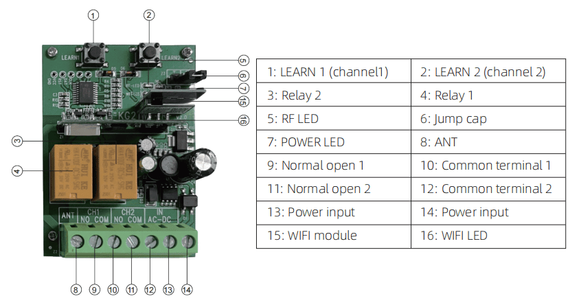 This receiver has 2 channels. It can connect to two gate openers at the same time. This is great for properties with multiple entrances, like a front gate and a backyard gate. You can control each gate opener independently. Use either the Tuya APP or the corresponding remotes. This eliminates the need for multiple receivers and simplifies your access control setup.