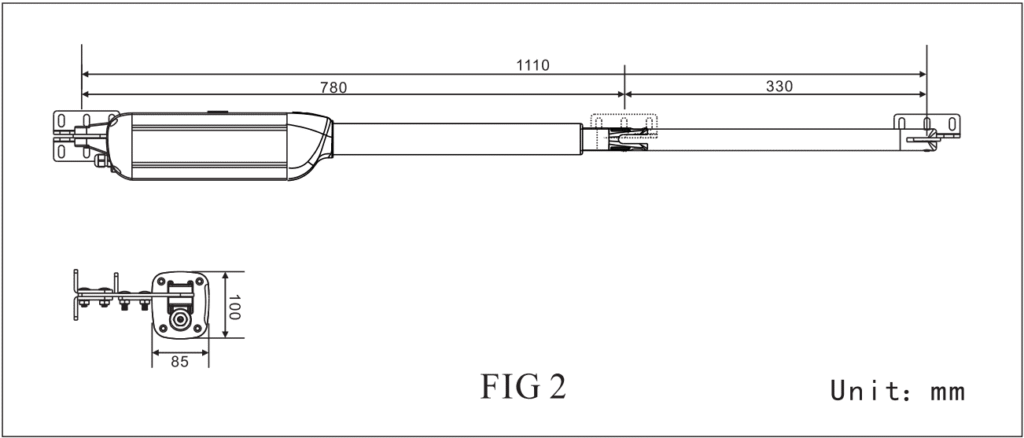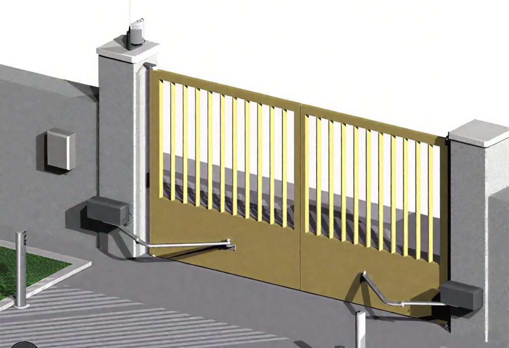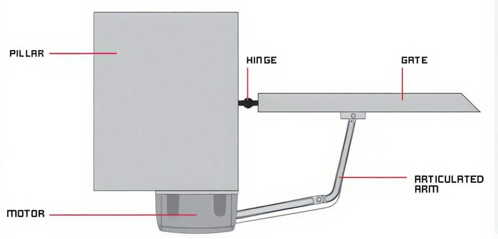 This opener uses a crank-arm structure. Specifically, you mount the motor on the door frame or gate post side. One end of the crank arm connects to the motor, and the other end connects to the gate leaf. The gate moves relying on the crank arm’s expansion, contraction, or rotation.