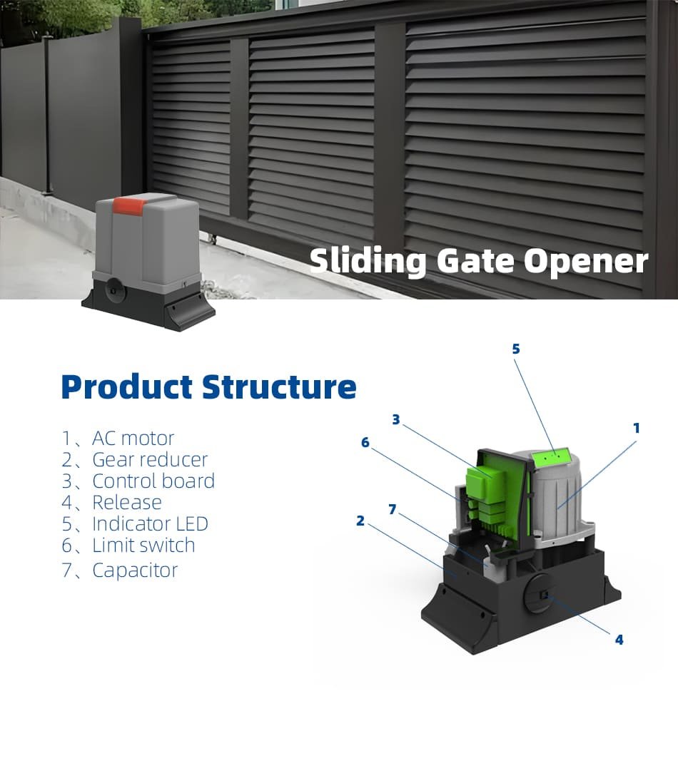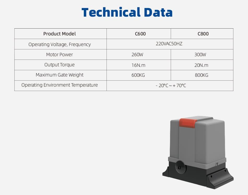 C-Slider is an automatic sliding gate operator. It features an AC motor with 260W/300W power, 16N.m/20N.m output torque, and 1400r/min rotational speed, suitable for gates up to 600kg/800kg .